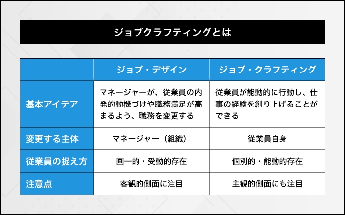 簡単にいえば、「やりがいを感じられない仕事をやりがいのあるものに変えていく手法」であり、従業員が自分の意思で業務の価値や仕事の役割を再定義する点に特徴があります。