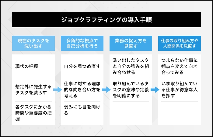 ジョブクラフティングを導入する際には、前述した「ジョブクラフティングの3つの視点」を意識しながら、適切な段階を踏んで行うことが大切です。ここでは、具体的に導入するステップを4つに分けてご紹介します。