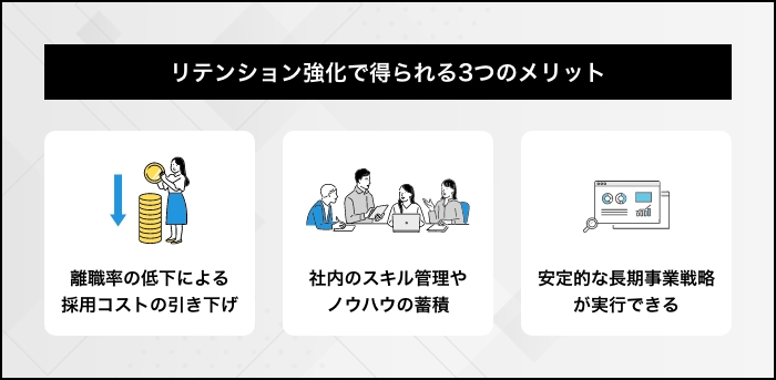 前述のように、売り手市場が続く現代のビジネス環境では、人材不足が企業の経営状況を悪化させる原因にもなりかねません。リテンション強化を行い、必要な人材が安定的に確保できている状態を保てれば、企業経営そのものも安定させることが可能です。