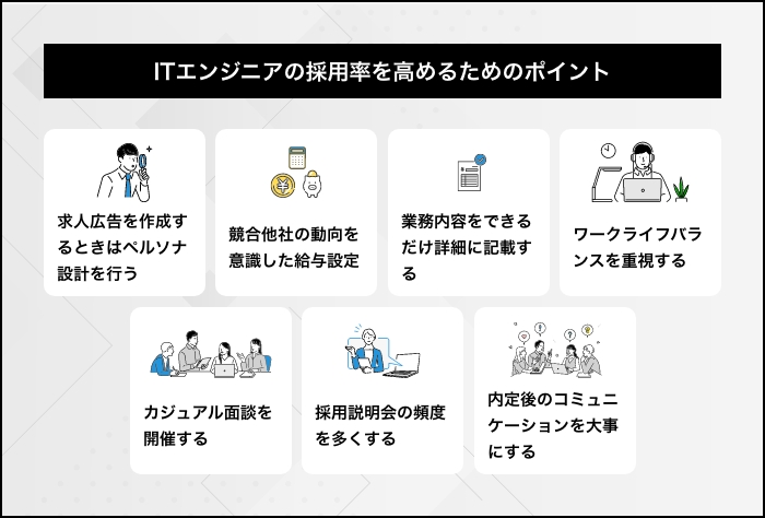 採用活動を円滑に行うためには、ITエンジニアの採用率を高めるための基本的なポイントを押さえておく必要があります。主なポイントとして、次の点が挙げられます。
