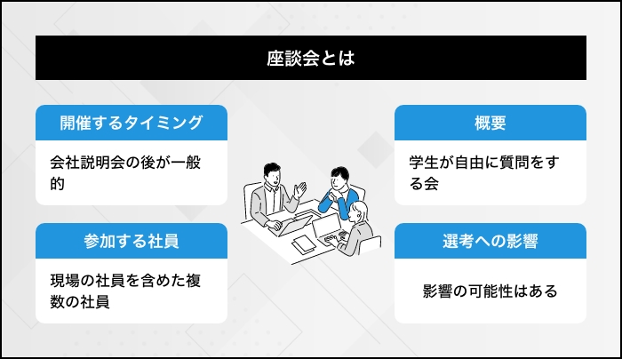 座談会とは、会社説明会などの就職活動イベントのあとに自社の社員と学生が交流する場のことを指します。