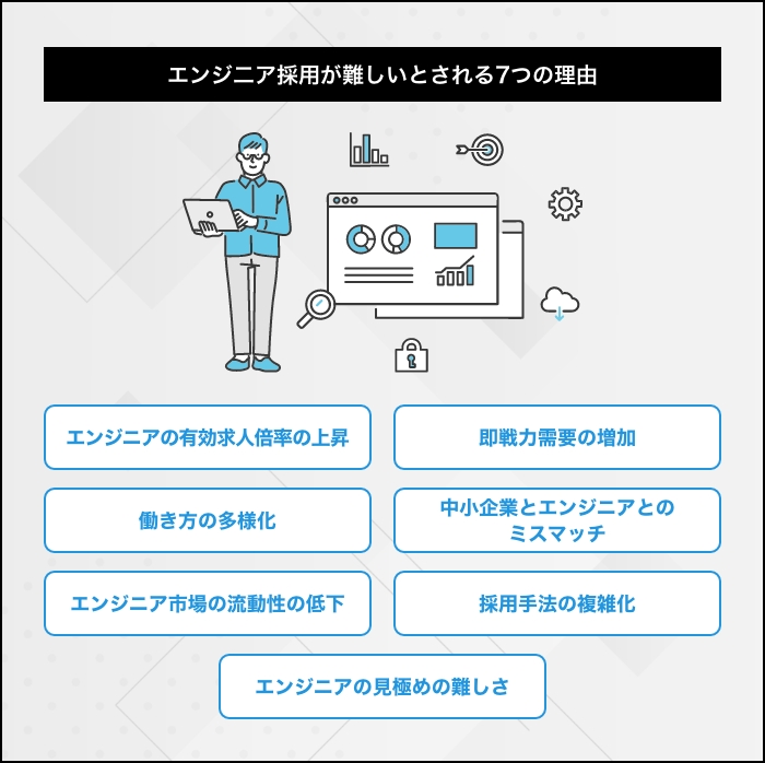 DXの推進などによりIT人材の需要が高まっている近年では、エンジニア採用が急務となっています。しかしエンジニアは、特に採用が難しいとされている職種の一つです。その背景には、以下の7つの理由があります。