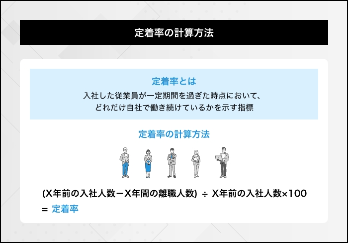 (X年前の入社人数-X年間の離職人数)÷X年前の入社人数×100=定着率