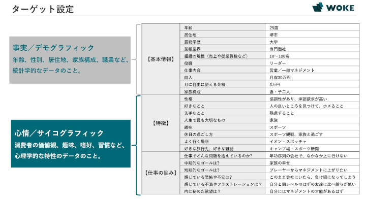 多くの企業がデモグラフィックに関するターゲット設定は実施しています。ですが、デモグラフィックと対をなすサイコグラフィックと言われる心情面の設定が欠けているケースが多くあります。