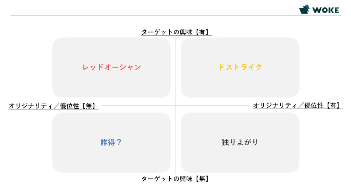 世の中にある当たり障りのない平凡なメッセージを、手垢のついていないコピーに変換することで、ターゲットの興味を増幅し、オリジナリティ/優位性を高め、「レッドオーシャン」「独りよがり」から「ドストライク」の象限に持っていくことができます。