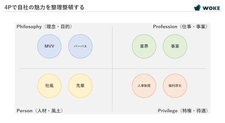 採用広報の4Pは 「人が組織に共感する4つの要素(4P)」に沿って自社の魅力をわかりやすく整理するための、採用戦略に関するフレームワークです。