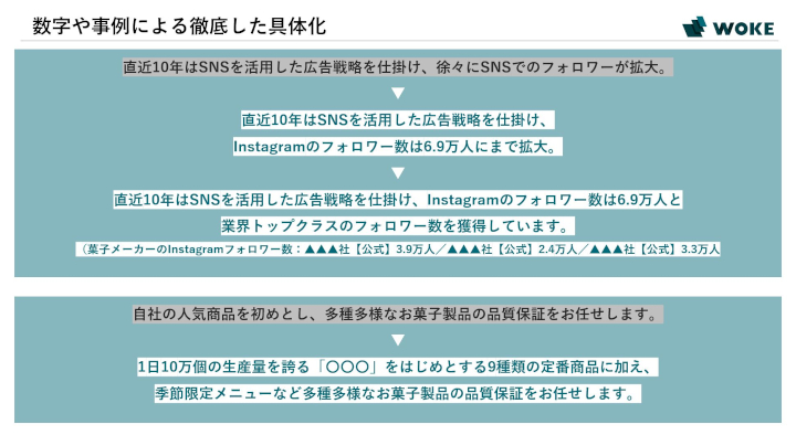 また、コピーや文章表現に自信がないという方にお勧めなのが「徹底した具体化」です。