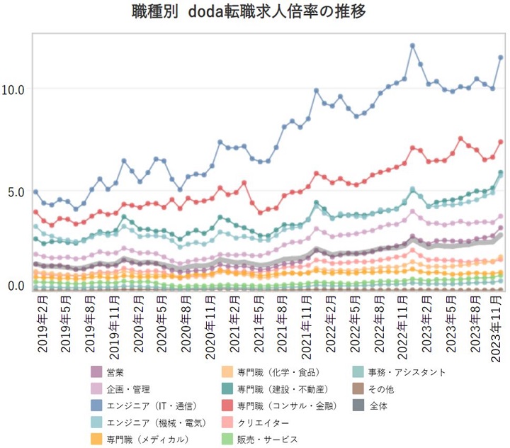 ※doda転職求人倍率の定義:「doda転職求人倍率」は、dodaの会員登録者(転職希望者)1人に対して、中途採用の求人が何件あるかを算出した数値です。