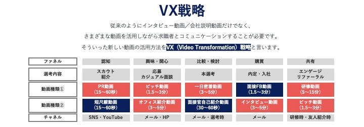 北原氏:スマートフォンで動画を撮影して応募者へ送るだけです。場合によってはメールを書くより楽な場合もあります。私はこうしたビジュアルを使った訴求をVX(ビデオ・トランスフォーメーション)と称して、みなさんに推奨しています。VX施策のポイントは、最初は短く、応募者に会社や仕事内容を伝える、選考プロセスの中盤になってきたら少し長めの動画を入れるなど、応募者の関心度に合わせて徐々に尺を長くすることです。