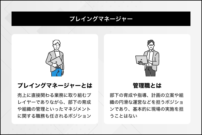 プレイングマネージャーとは、売上に直結する業務を担うプレイヤーとしての役割と、部下や組織をマネジメントするマネージャーとしての役割をあわせ持ったポジションを指します。