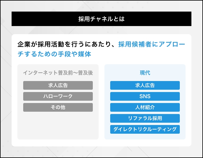 代表的な採用チャネルとしてあげられるのは、従来広く用いられてきた求人広告や人材サービス会社による仲介です。そこから、サービスの進歩とともに採用チャネルの種類も多様化してきており、現在では企業側から主体的にアクションを起こせる選択肢も増えています。