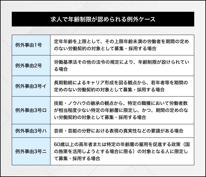 しかし、条件によっては例外も設けられているので、年齢制限を行う場合は各例外規定の内容をチェックしておきましょう。