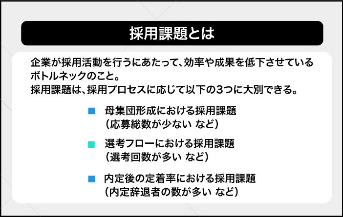 採用課題は、採用プロセスに応じて以下の3つに大別することができます。