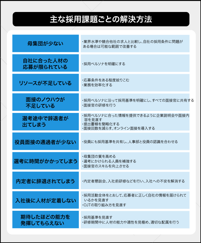 ここからは、具体的な採用課題をピックアップして、解決方法やそのために必要なアプローチをご紹介します。