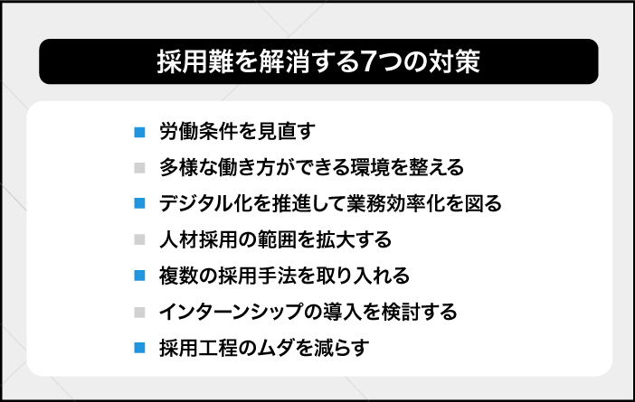 採用難を乗り越えるためには、さまざまな角度から自社の課題を洗い出し、必要に応じて対策を実施する必要があります。ここでは、採用難を解消するために企業ができる、7つのアプローチを詳しく見ていきましょう。