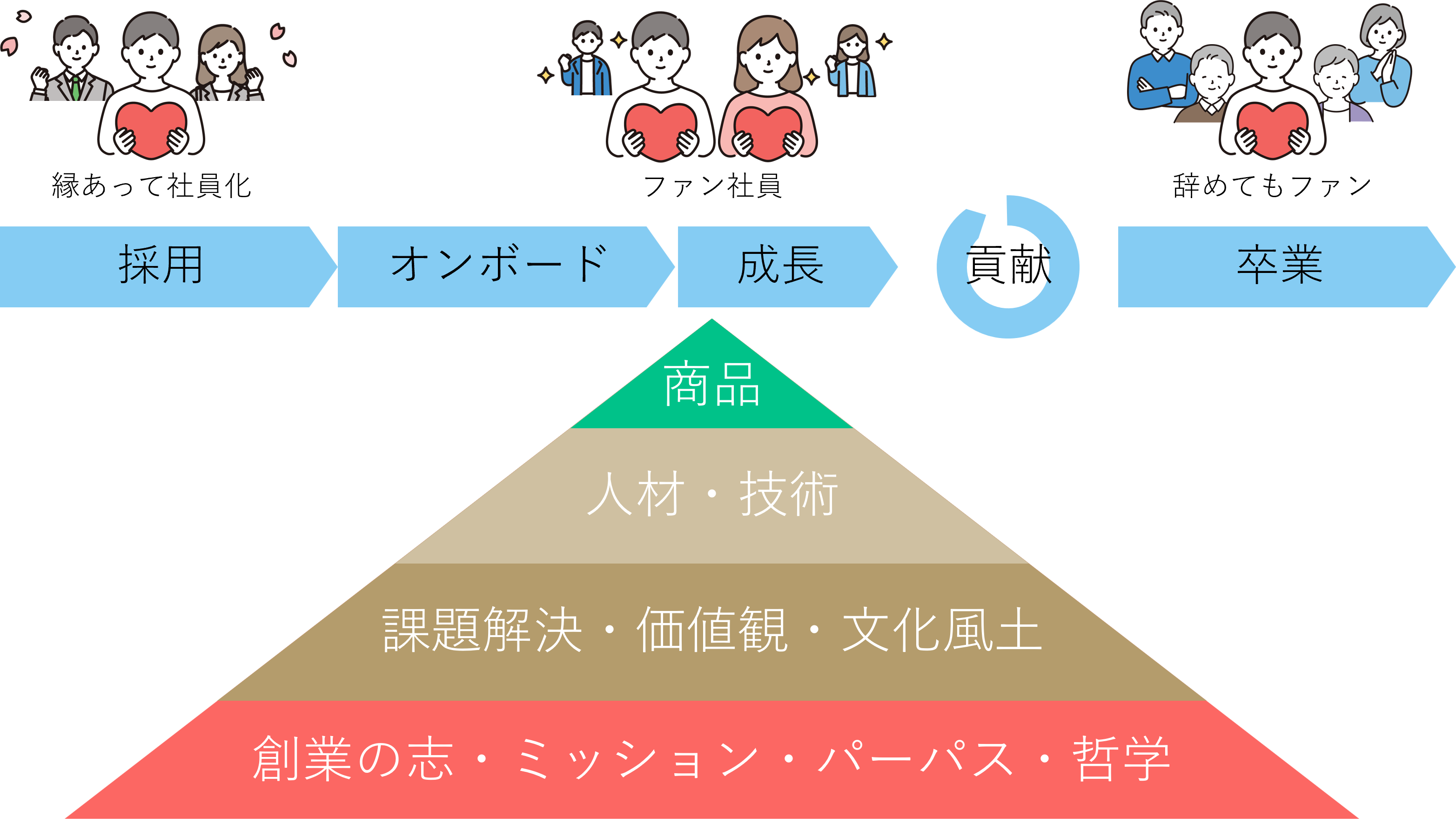 採用からオンボーディング、成長、卒業までを一つの流れとして捉えると、ファンベースの効果は長期的に企業を支える仕組みとなるのです。