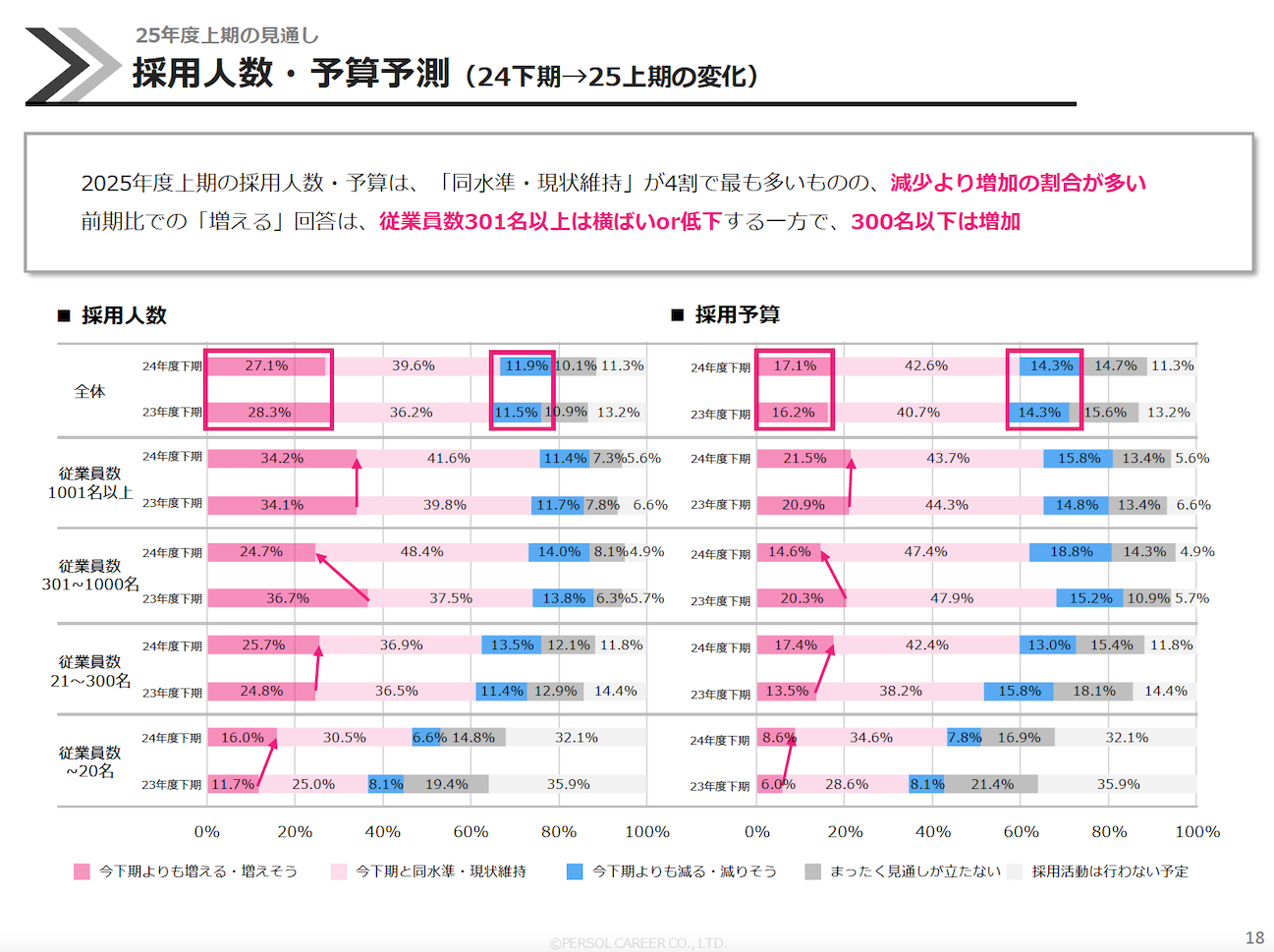 ――24年下期から25年上期にかけて、採用人数や採用予算についてはどんな変化が見られますか。