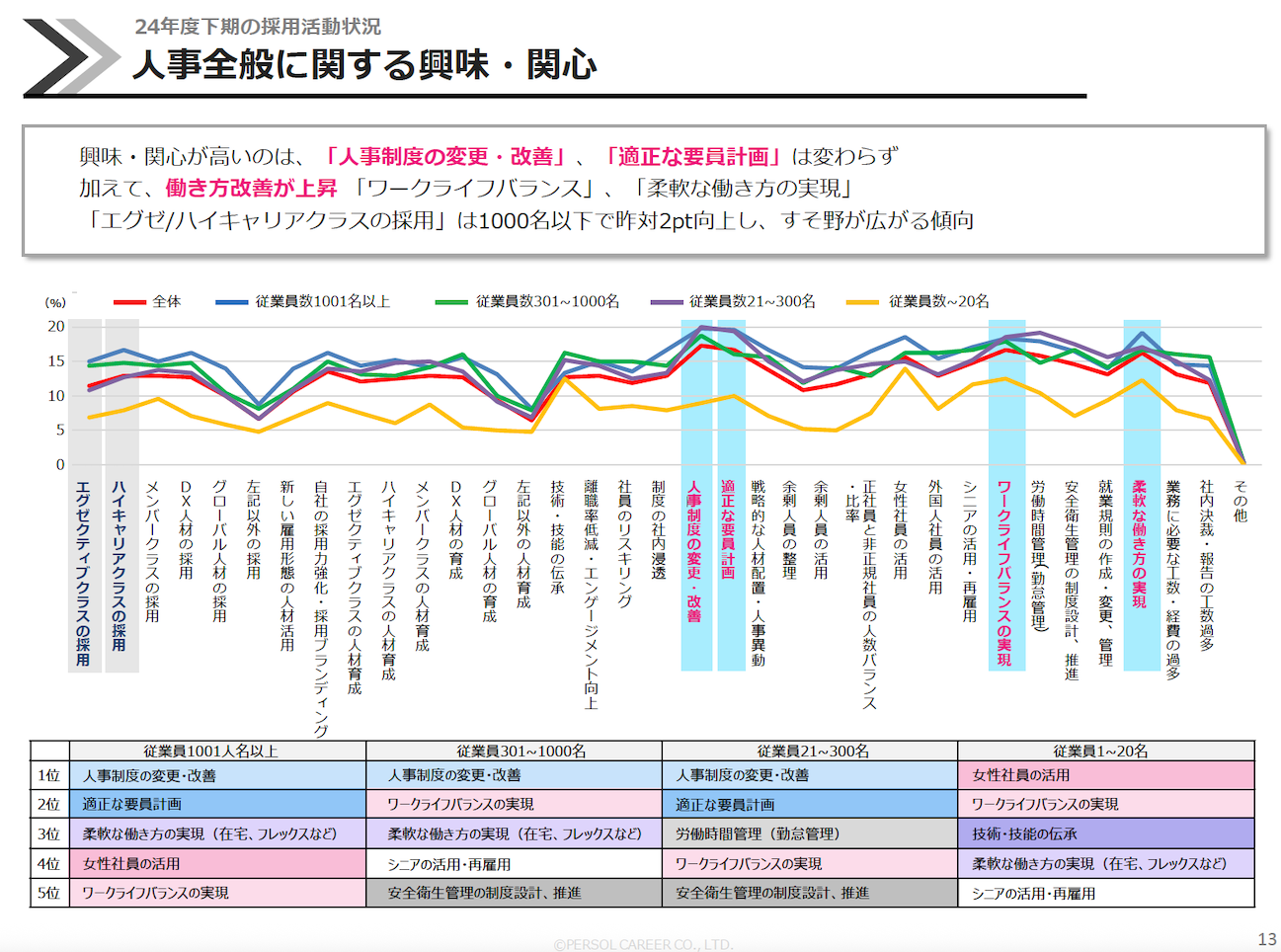 髙尾氏:以前の調査(「2024年度上期法人市場調査結果」)から引き続き回答が多いのは「人事制度の変更・改善」「適正な要員計画」です。最近高まっているのは「はたらき方の改善」「ワークライフバランス」。また前回との比較では、「エグゼクティブ層の採用」はこれまでは1,001名以上の企業で注目度の高い項目でしたが、今回はその他の企業規模でも注目が高まっていますね。