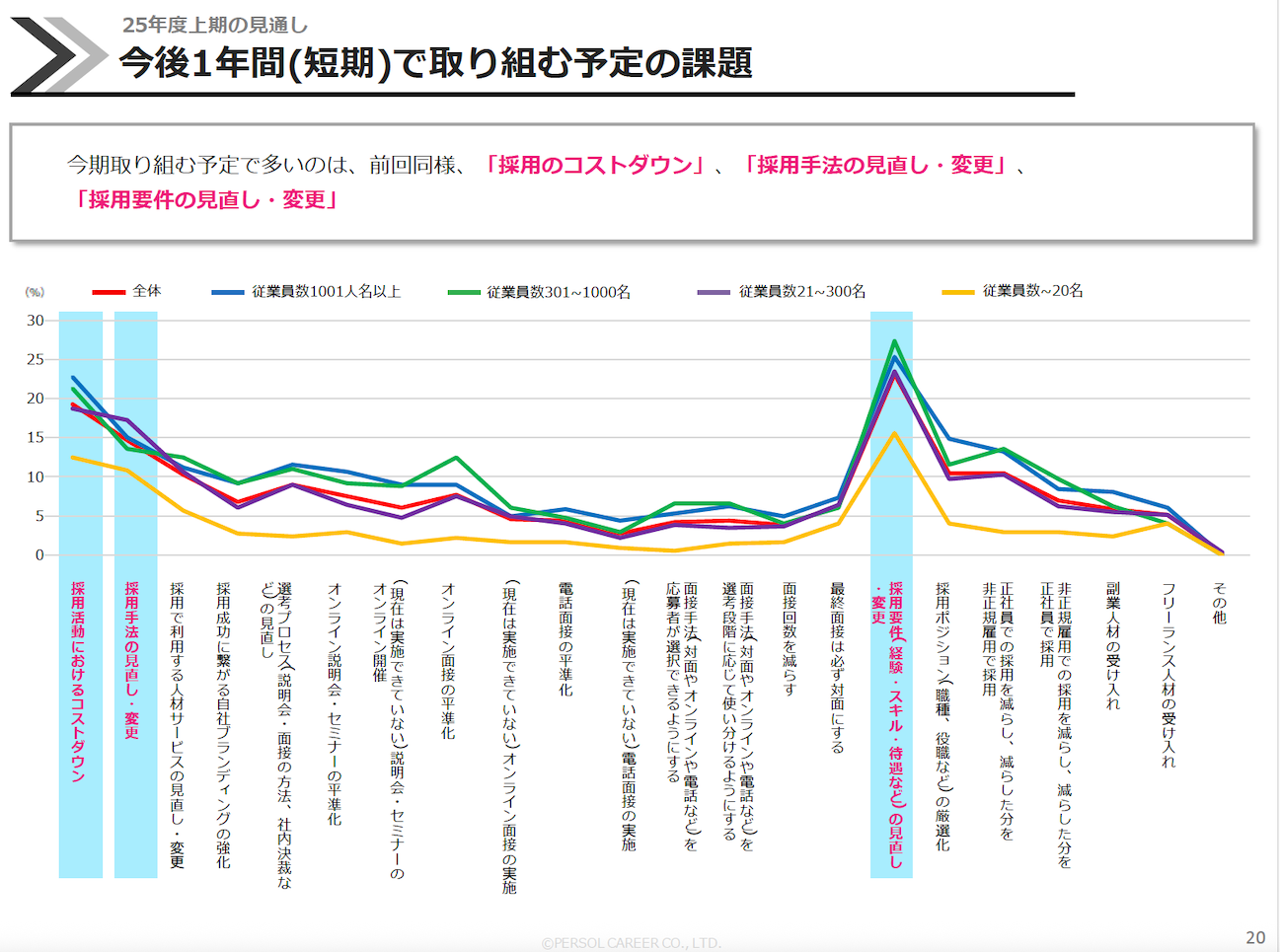 髙尾氏:従業員数1,001名以上と、301~1,000名の企業では、2024年下期と比べて2025年上期は、採用人数や予算が「横ばいもしくは減少」に転じています。全体で見ると「同水準・現状維持」が多く、採用規模や予算が増えるという回答は減少しており、高止まりという印象です。