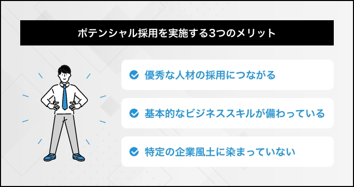 それでは、企業がポテンシャル採用を実施することには、具体的にどのようなメリットがあるのでしょうか。ここでは、3つの視点から掘り下げて見ていきましょう。