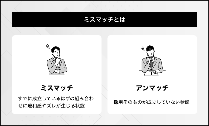 ミスマッチと似ている言葉に「アンマッチ」があります。こちらは、両者が一致していない様子を指す言葉であり、人材採用においては「採用そのものが成立していない状態」を意味します。