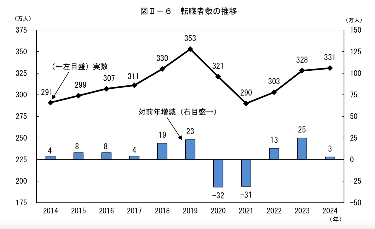 総務省統計局が令和6年(2024年)に実施した「労働力調査」によると、2014年に291万人であった転職者数が、2024年には331万人にまで増加したことが判明しました。