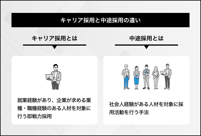 就労経験のある人材を対象とした採用活動に、中途採用もあります。キャリア採用と中途採用では、以下のように採用条件の範囲が異なります。