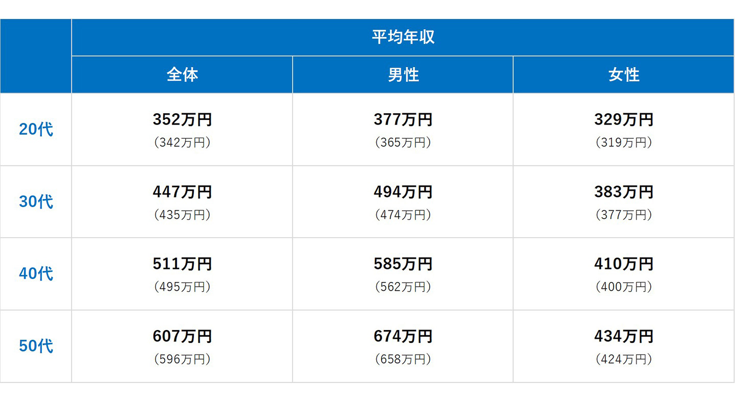 2023年の年代別の平均年収は「20代」が352万円、「30代」が447万円、「40代」が511万円、「50代以上」が607万円でした。各年代の前回からの上昇幅は20代が10万円アップ、30代が12万円アップ、40代が16万円アップ、50代以上が11万円アップです。男女別に見ても男性は全年代、女性は20代・40代・50代以上で10万円以上アップしています。