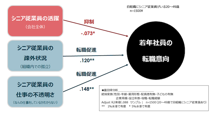 山崎氏:例えばパーソル総合研究所の調査では、「シニアが不活性だと若手の離職率が上昇する」という因果関係も示されています(※2)。シニアの社員が生き生きと働いていないような職場では、若手社員の転職意向が高まり、一方で、シニア社員が活躍している職場では転職意向が抑制されているデータがあります。こうした情報も大いに参考になるのではないでしょうか。