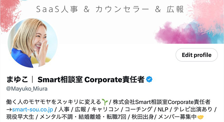 実際に公式アカウント以外の取り組みで企業・採用ブランディングを向上させる成功例も増えてきました。オンラインカウンセリングサービスを提供する株式会社Smart相談室の三浦麻友子さんも“注目を集める社員インフルエンサー”の一人です。企業としての取り組みだけでなく個人の考えや思いも積極的にポスト。その発信は見事に採用にもつながり、現在では年間中途入社者の半数がSNSで同社を認知しているといいます。