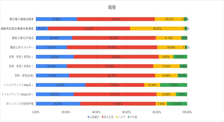 菊池氏:ITエンジニアやクリエイティブ系では「その他」も目立ちますね。ここにはスカウトサービスも多く含まれているのだと思います。明確な要件定義に基づいて特定のスキルを保有する方を求めることが多い職種であり、採用難易度が高く、新しい採用手法を取り入れることが多い領域でもありますから。
