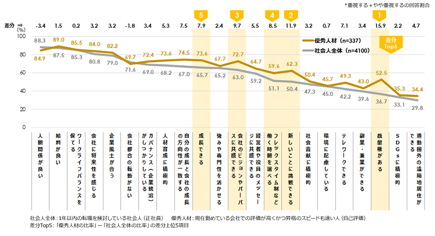 高度なスキルや専門性を持つ人材が転職時に重視するのは、「成長機会」や「企業のビジョン・パーパスへの共感」「フレックスタイム制など柔軟なはたらき方 」「新しいことへの挑戦機会」「裁量の大きさ」などが挙げられます。「年収や条件」「ワークライフバランス」といった条件は、すでに「前提条件」に過ぎません。
