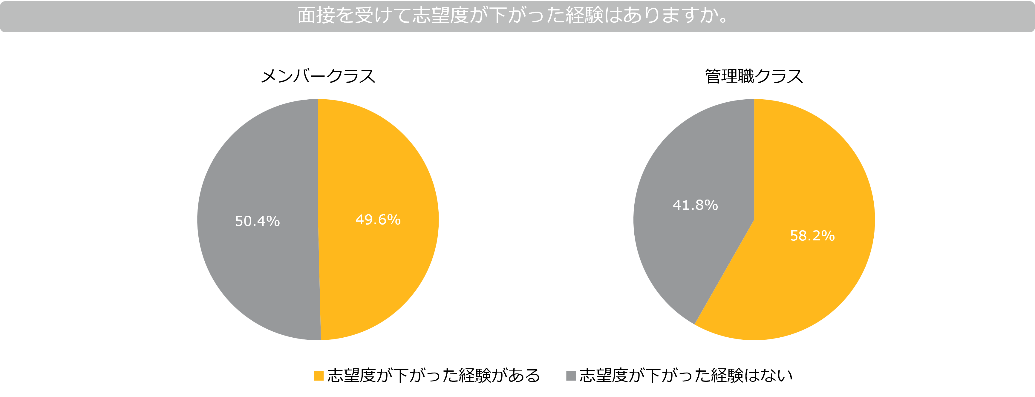 どちらのクラスにおいても約半数が「志望度が下がった経験がある」と回答しており、面接内容や面接官の対応が志望度に影響を与える可能性があることがうかがえます。中でも管理職クラスではメンバークラスと比較して「志望度が下がった経験がある」人の割合が多いことから、面接が志望度に強く影響しているようです。