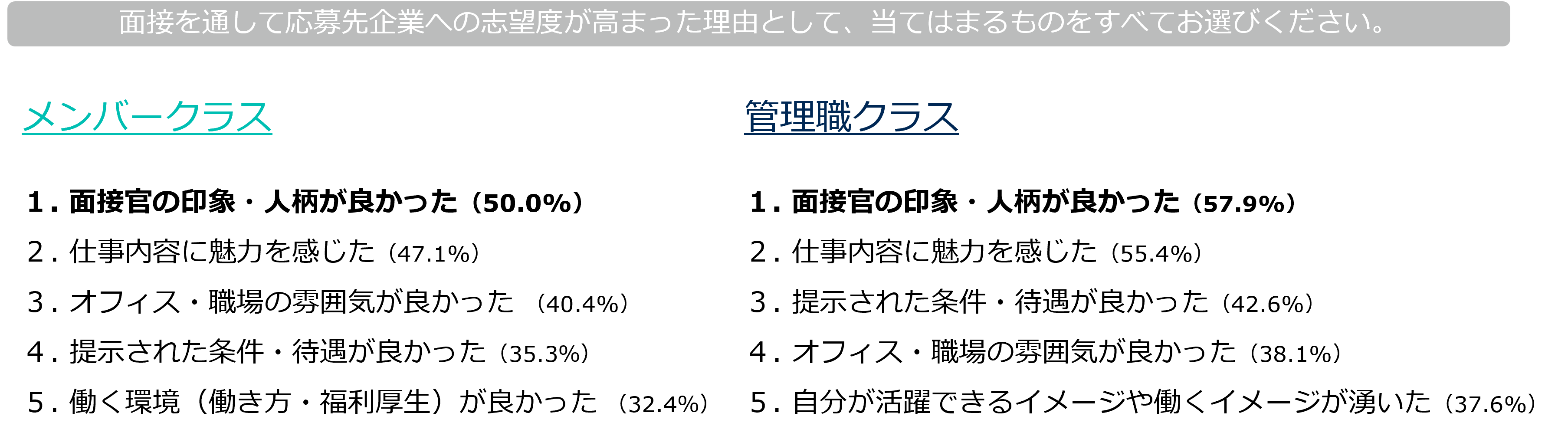 面接を通して志望度が高まった理由について、両クラスとも「面接官の印象・人柄が良かった」が最多。メンバークラスでは50.0%、管理職クラスでは57.9%が回答しており、いずれも半数を超えています。両クラスとも「仕事内容に魅力を感じた」が2番目に多く、メンバークラスでは47.1%、管理職クラスでは55.4%でした。