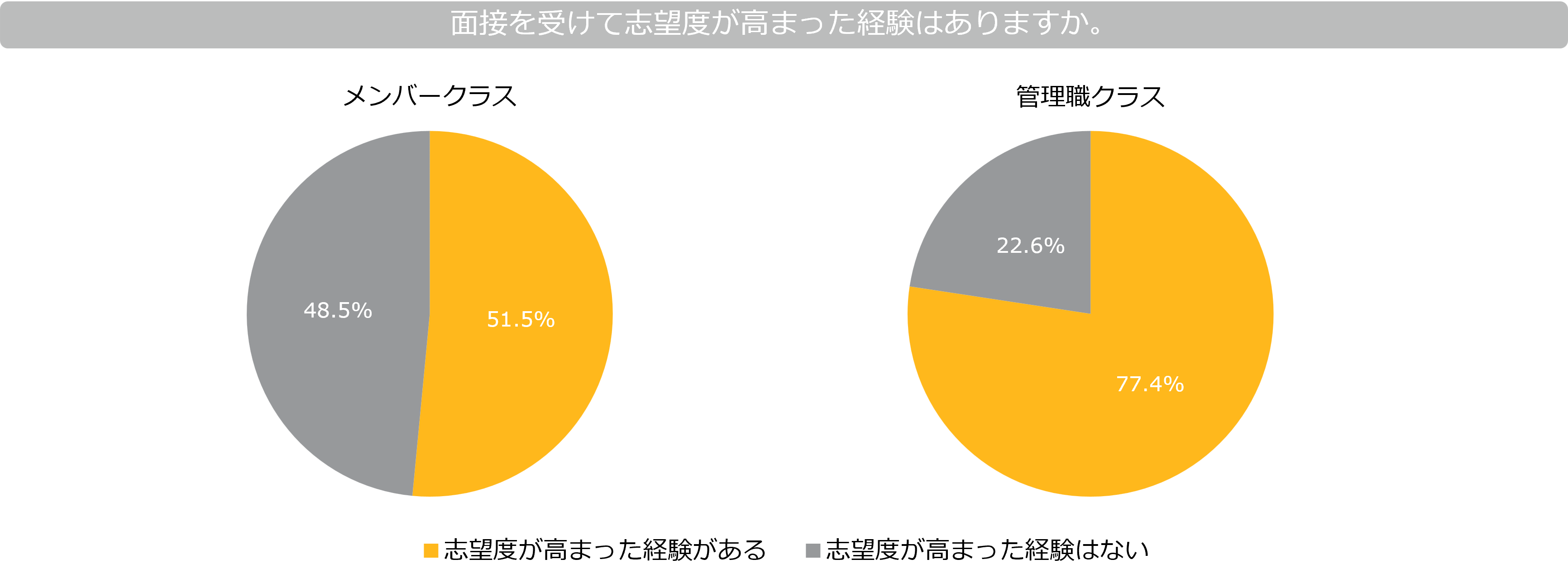 面接を受けて志望度が高まった経験について、メンバークラスでは、51.5%が「志望度が高まった経験がある」、48.5%が「志望度が高まった経験がない」と回答。一方、管理職クラスでは、77.4%が「志望度が高まった経験がある」、22.6%が「志望度が高まった経験がない」と回答しました。