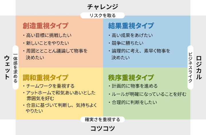 また、私たちが活用している適性検査では、相手にどのようなコミュニケーションを取ると良いかを4象限に分けてマッピングしてくれます。縦軸は「リスクを取る」と「確実さを重視する」、横軸は「ビジネスライク」と「一体感を求める」です。