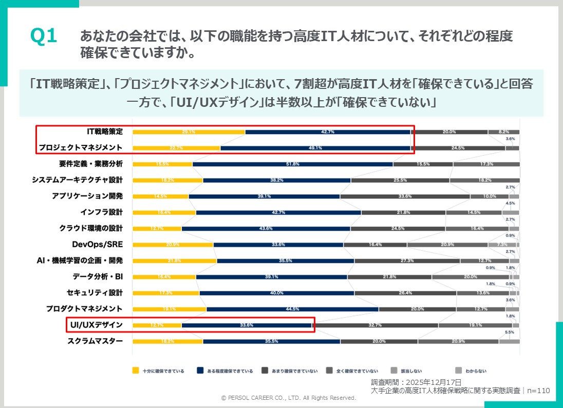 職能別の確保状況では、「IT戦略策定」「プロジェクトマネジメント」は7割超の企業が「確保できている」と回答。一方、「UI/UXデザイン」は半数以上が「確保できていない」と回答し、職能によって確保のしやすさに大きな差があることが明らかになりました。