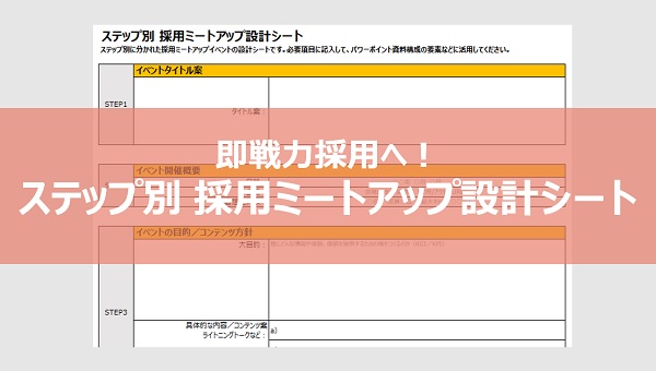 ステップ別に分かれた採用ミートアップイベントの設計シートです。必要項目に記入して、パワーポイント資料構成の要素などに活用してください。即戦力採用のイベント開催と設計に有効です。