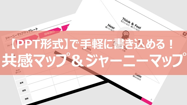 昨今、デザイン思考を活用した取り組みが増えつつあります。デザイン思考を実践いただく際、フレームワークとしてご活用いただきやすい、「共感マップ」「ジャーニーマップ」のフォーマットをご用意しました。PPT形式のため、ダウンロード後すぐに書き込んでいただけます。