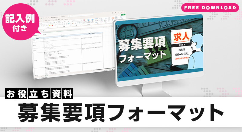 人材を新たに募集する際に人事・採用担当者が必ず作成する募集要項。しっかりと情報をまとめておかないと、思うように人材が集まらなかったり、知らず知らずの内に職業安定法などの法律違反を犯してしまったりするリスクもあります。そこで「募集要項」の基本的な項目や情報をまとめる際の注意点がわかるフォーマットをご用意しました。ぜひ自社用にカスタマイズしてご利用ください。