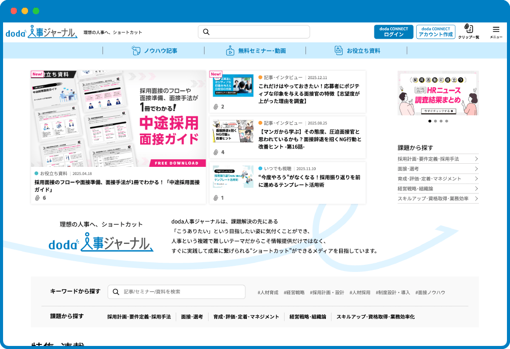 doda人事ジャーナルは、人事領域の課題を解決するだけでなく、その先にある「ありたい姿」を描けるように支援します。人事という複雑で難しいテーマだからこそ、情報発信だけでなく、すぐに実践でき成果へ直結する“ショートカット”を提示するメディアを目指しています。