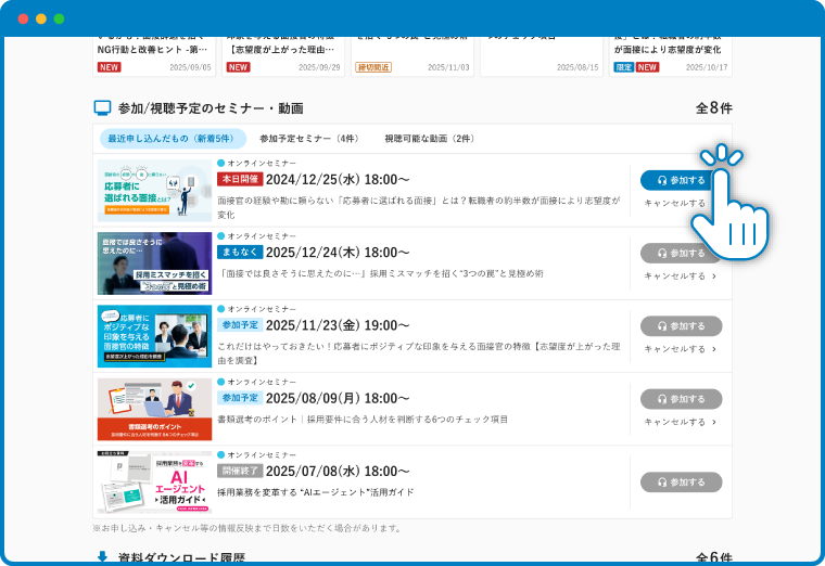 開催間近のセミナーだけでなく、過去に参加したセミナーや閲覧した動画、